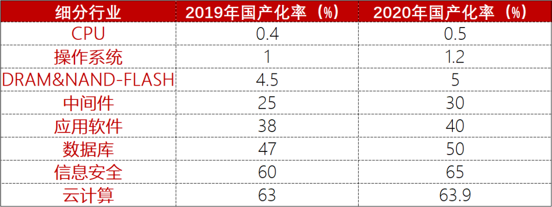 2019-2020年信创产业细分行业国产化率(单位:%)
