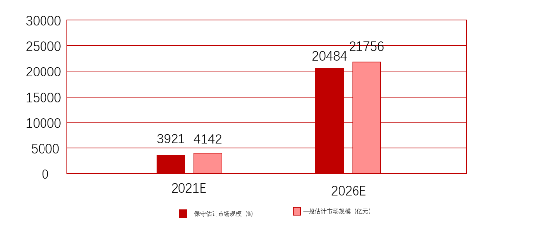 结合2021-2026年中国信创产业预计国产化率计算得到中国信创产业市场规模变动情况。在保守估计下,中国信创产业市场规模在2026年或将突破2万亿,2021-2026年年复合增长率为39.19%;在一般估计下,中国信创产业市场规模在2026年或将突破2.1万亿,年复合增长率为39.34%。